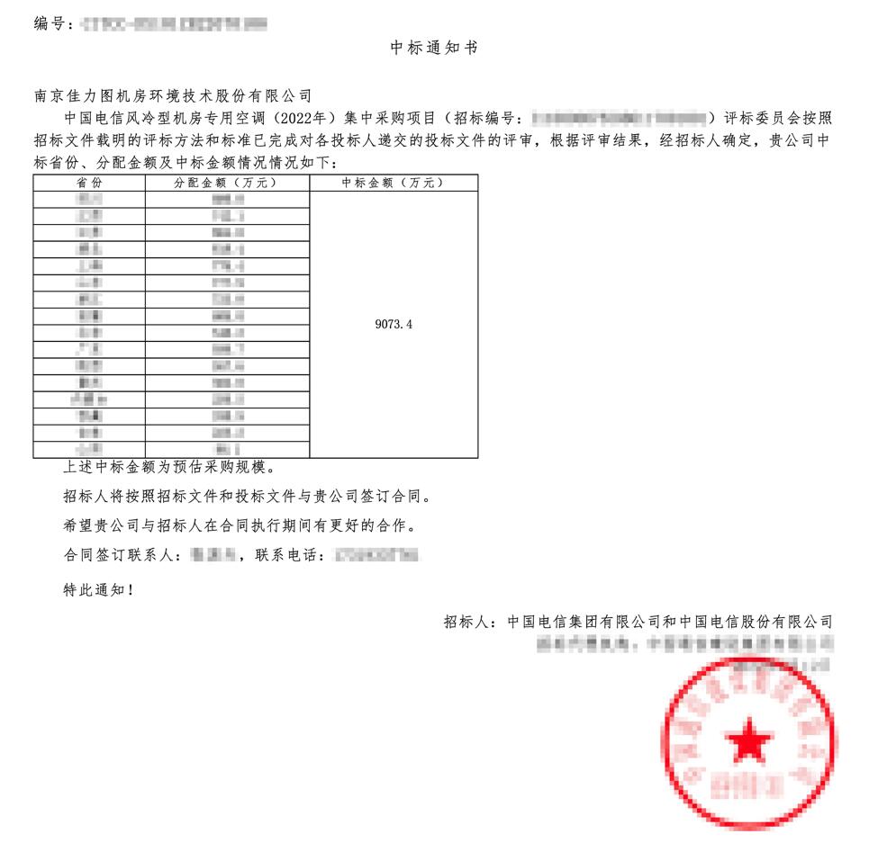7月12日,在中国电信电子采购系统平台发布的《中国电信风冷型机房专用空调(2022年)集中采购项目中标通知书》中,南京佳力图机房环境技术股份有限公司被确定评选为中标人,中标金额9073.4万元。