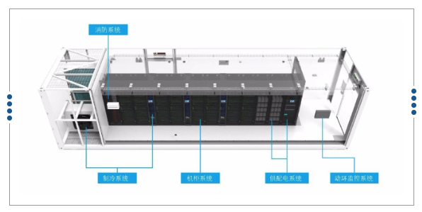 集成了UPS、配电、制冷、机柜、监控、消防等多个子系统,标准模块化部件,所有设备安装、调试工作均在工厂完成,缩短现场建设周期,现场接入网络和电源即可投入运行。