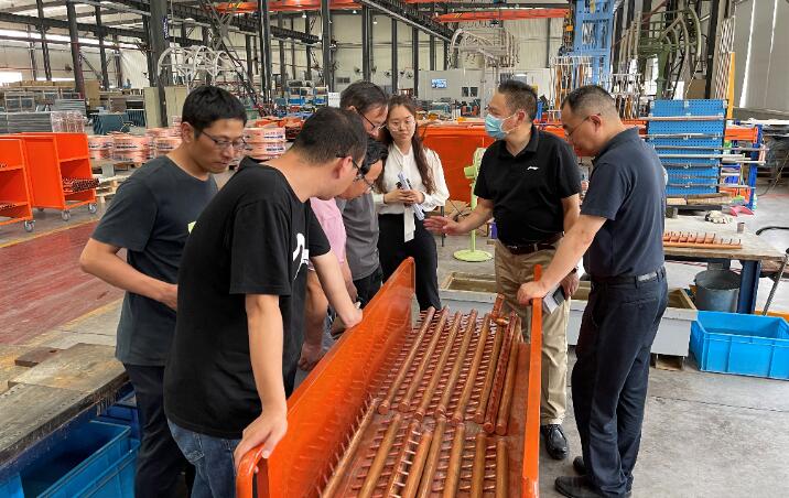 简单的午餐后,考察小组一行人来到佳力图的生产车间进行参观考察,相继参观了我司钣金车间、换热器车间、装配车间以及实验室,印雨馨为大家介绍了整个生产线的加工工艺、生产设备以及装配流程等等,对宽敞整齐的生产车间、井然有序的生产过程,严谨规范的品质把控,考察小组给予了极大的赞许。