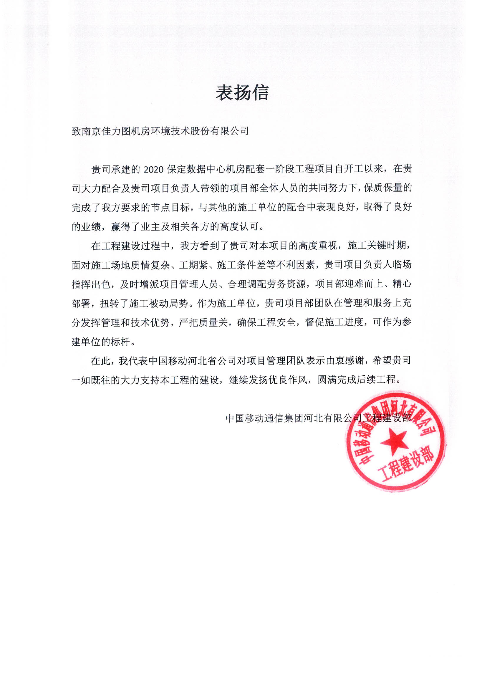 近期,佳力图公司领导收到了来自中国移动通信集团河北有限公司工程建设部的一封《表扬信》,信中对我公司项目负责人及项目全体人员在对2020保定数据中心机房配套一阶段工程项目中的良好表现提出表扬,同时对佳力图公司的技术实力和服务质量给予高度认可和赞赏,对此表示衷心的感谢!